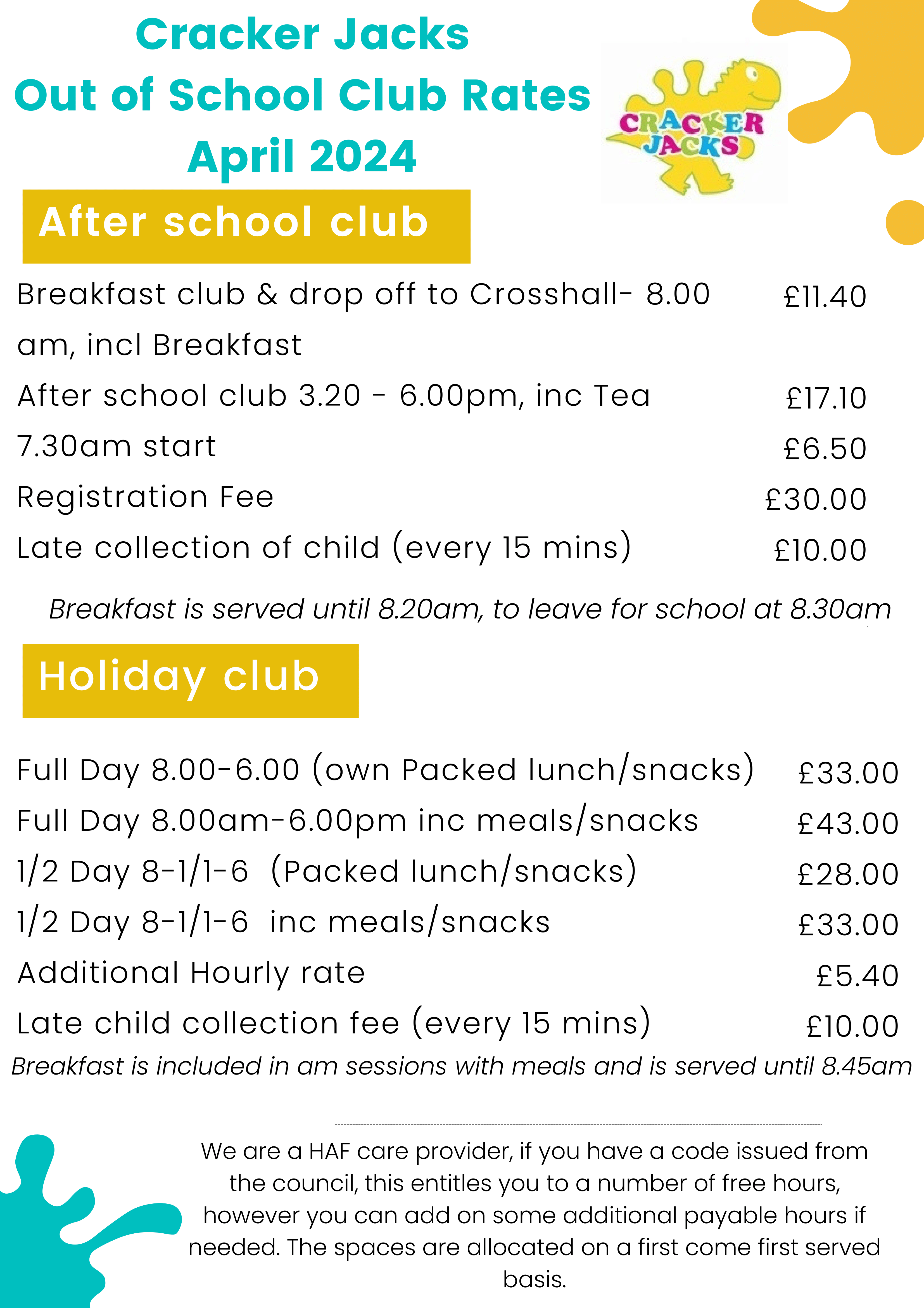 Cracker Jacks Out of School Club Rates April 2024