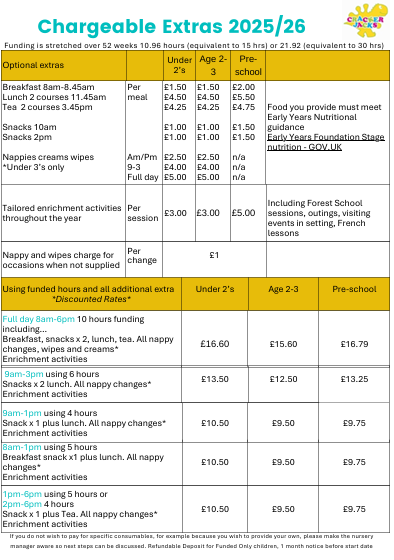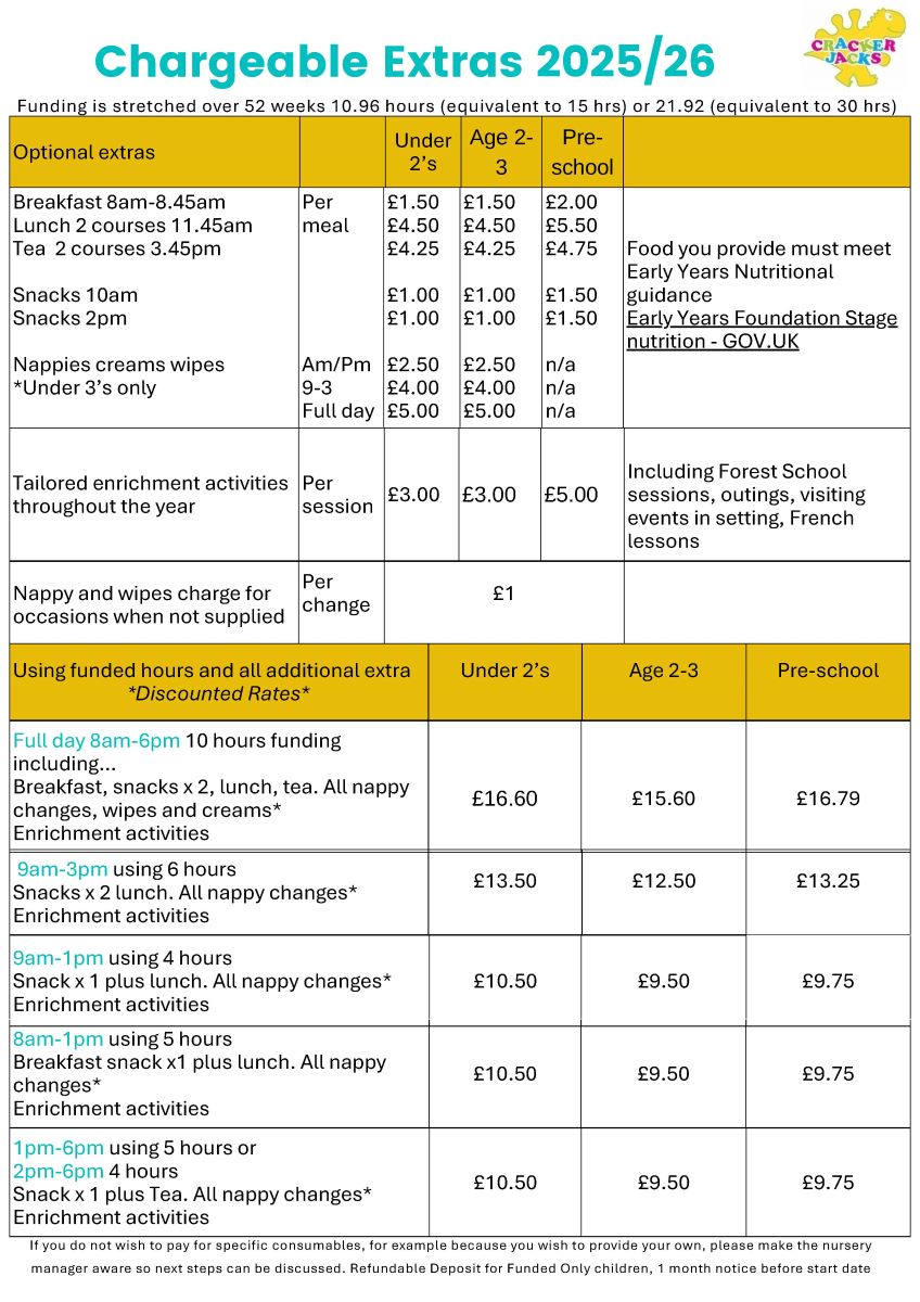 If you do not wish to pay for specific consumables, for example because you wish to provide your own, please make the nursery manager aware so next steps can be discussed. Refundable deposit for Funded Only children, 1 month notice before start date